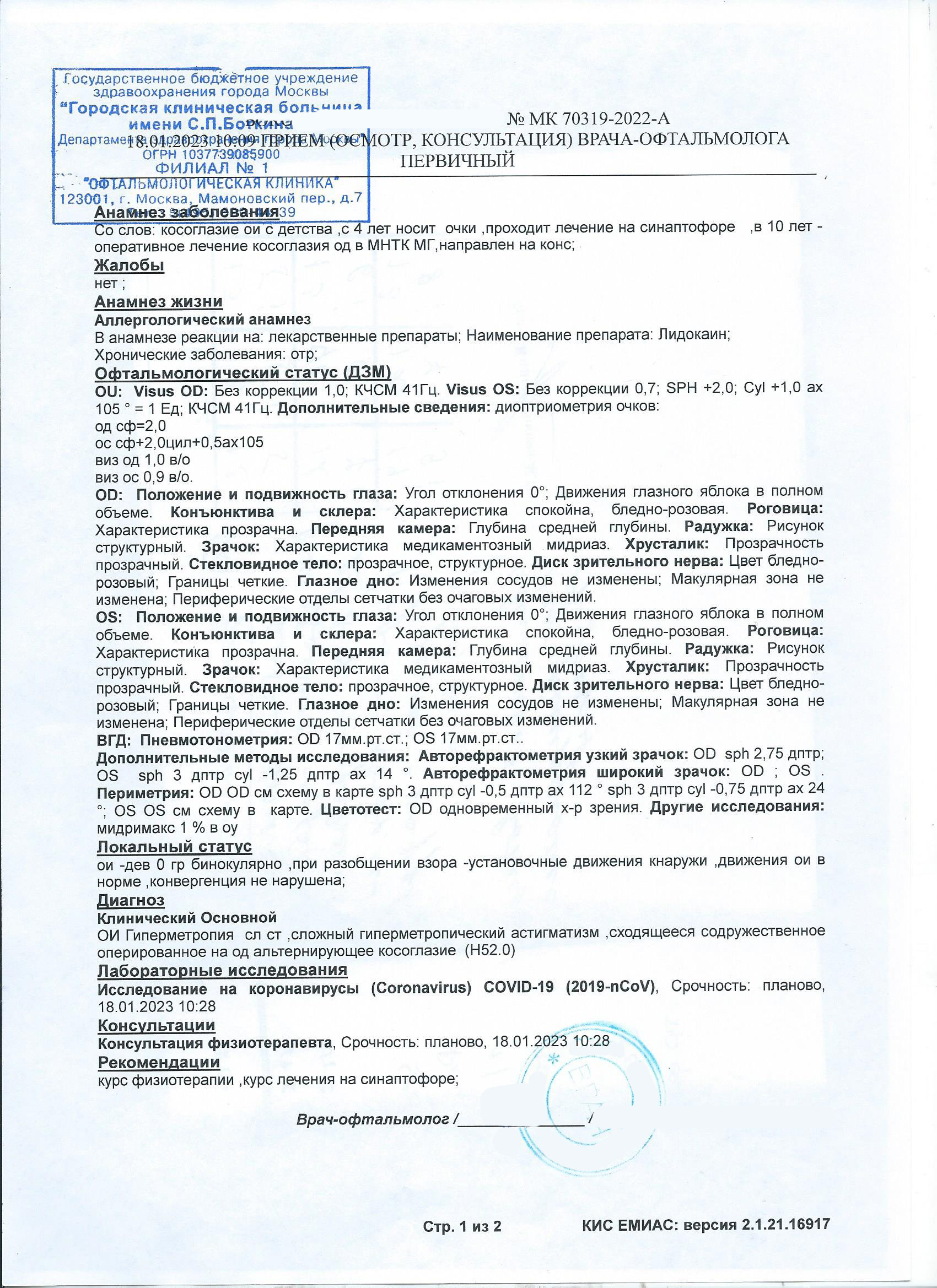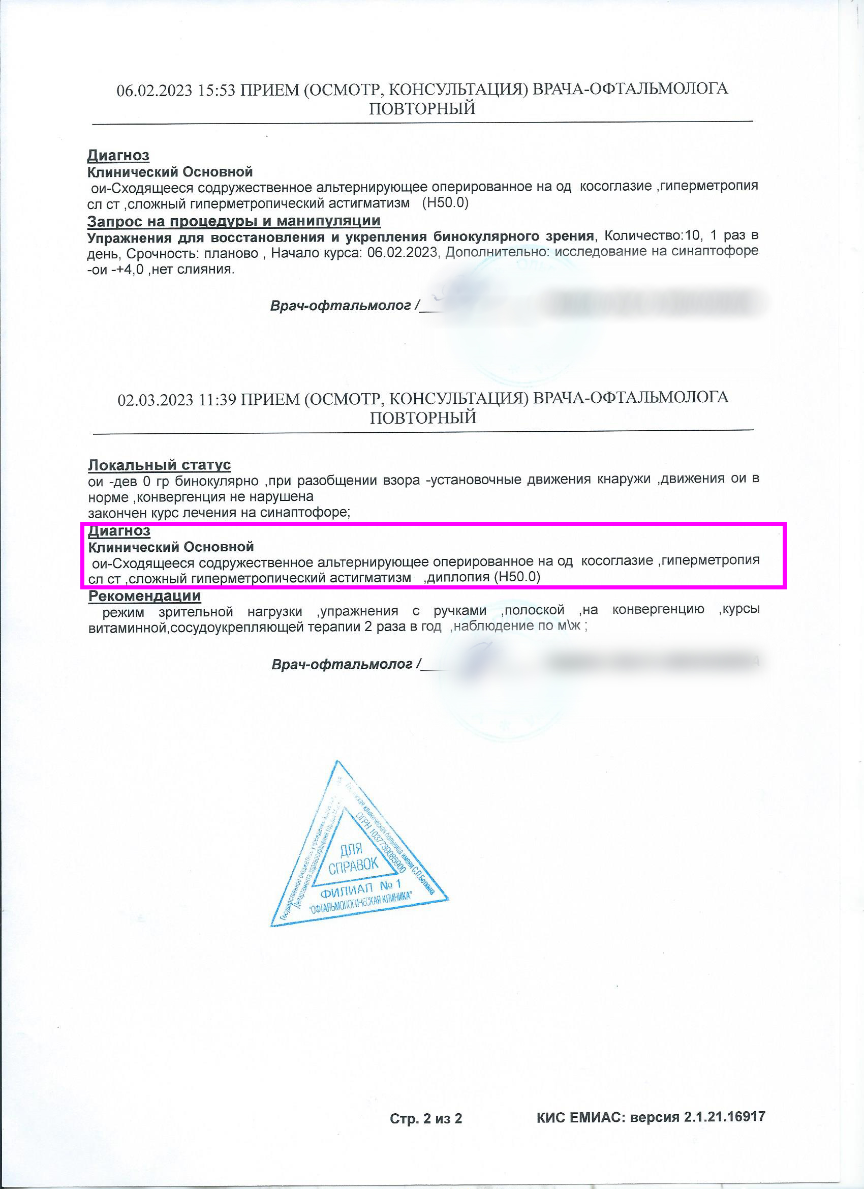 Последний диагноз: Сходящееся содружественное оперированное на правый глаз альтернирующее косоглазие, гипермертропия слабой степени, сложный гиперметропический астигматизм, диплопия (по схеме Гааба выявлено двоение во всех направлениях).