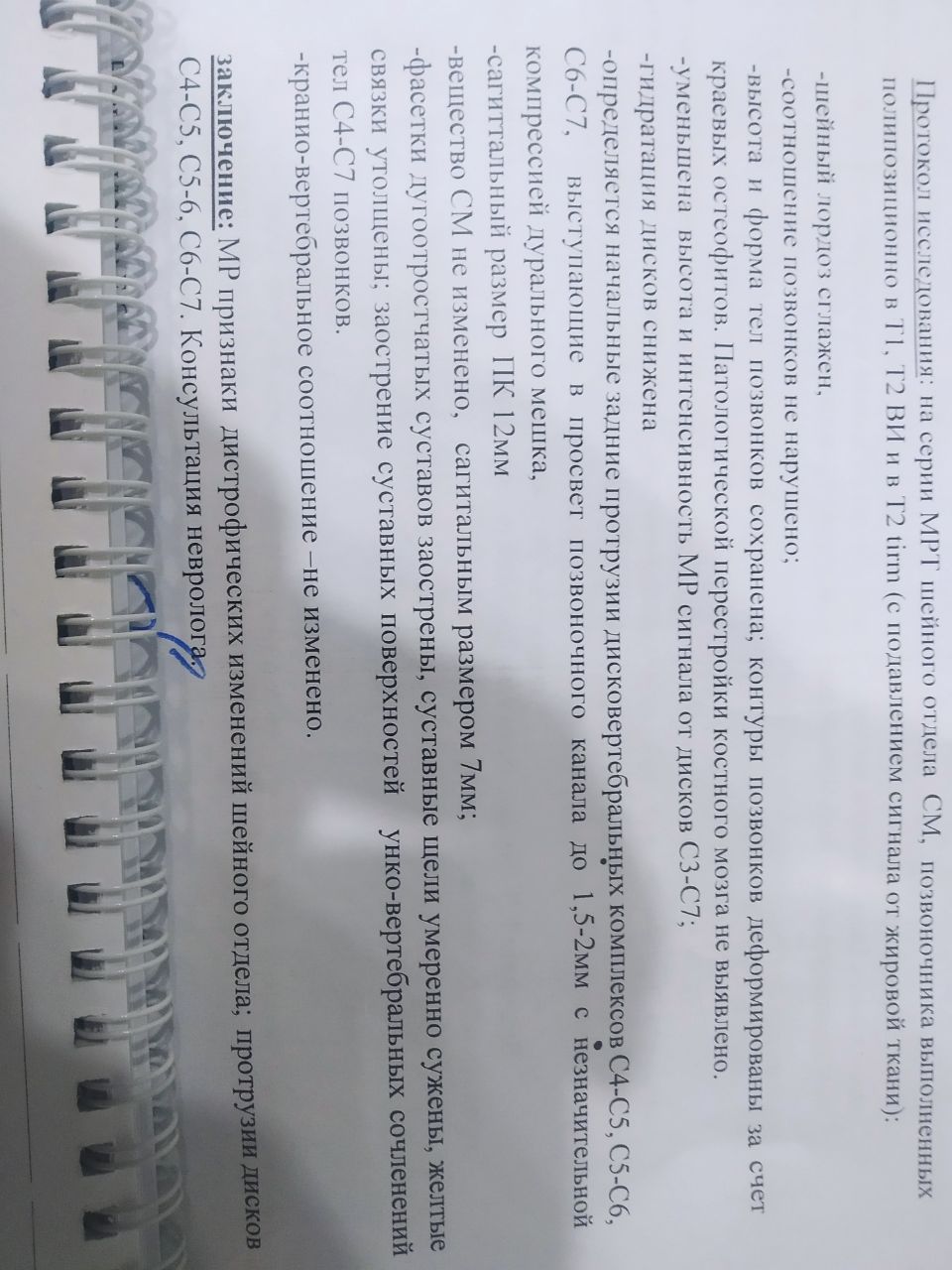 По шее пока ничего не отметили кроме церкивкалгии, протрузий диисков с4-с7, нестабильности позвонков с2-с5 (сразу скажу менее 3мм) я думаю из-за того, что в стационаре лечили только поясницу. Соответственно полные данные смогу приложить только после стационара, тк карточка пока в поликлиннике находится