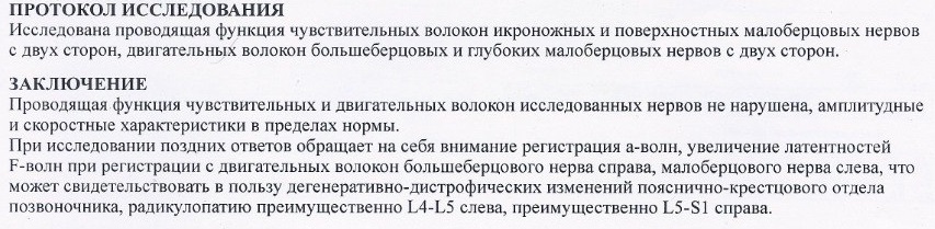 2. Боль в спине, отдающая в ноги, меня периодически беспокоит, но недавно также появилось сильное онемение в больших пальцах обеих ног, а также ощущение мурашек при прикосновениях по большей части стоп и голеней. Недавно успел сделать пока только электронейромиографию, но ее результаты от старой на картинке 2 не отличались, нарушений передачи сигналов не было описано. Является ли это основанием наличия нарушений функций?