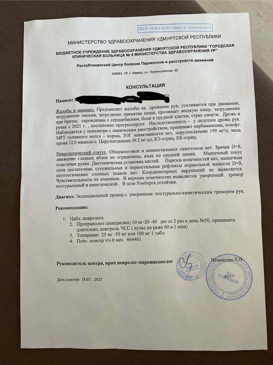 londonscammer писал(а):Добрый день, наблюдаюсь с 2021 г. у невролога с диагнозом "Эссенциальный тремор с умеренным постурально-кинетическим дрожанием рук", постепенно прогрессирует. С 2024 г. начались проблемы в жизни, не могу нормально держать ложку, проливаю пищу и воду и проблемы с письмом. Назначали анаприлин, но он не помог, назначили сейчас транквилизаторы. Спорт полностью запретили, любые нагрузки под запретом. Можно ли рассчитывать на категорию Д по этому заключению невролога? Документов много + анализы все сданы. Единственное меня смущает, что невролог описал мои нарушения в жизни в строке "Жалобы и анамнез", а не в "Неврологическом статусе". Повлияет как-то? Очень хотелось бы категорию Д. Невролог (у которой я наблюдаюсь), уверила меня, что должны списать, т.к она сама работает в военкомате, но не знаю правда это или нет.