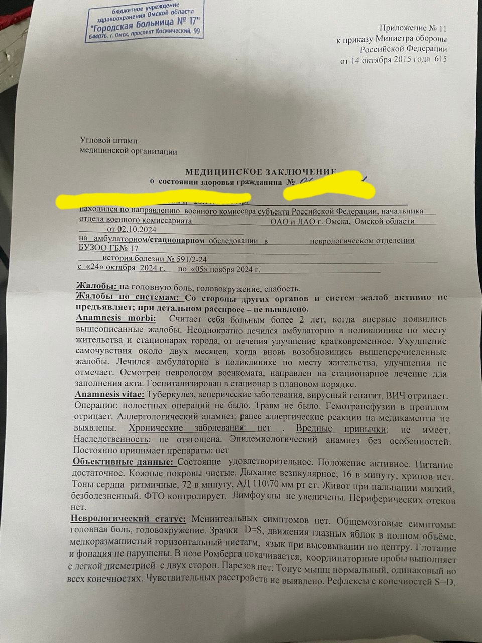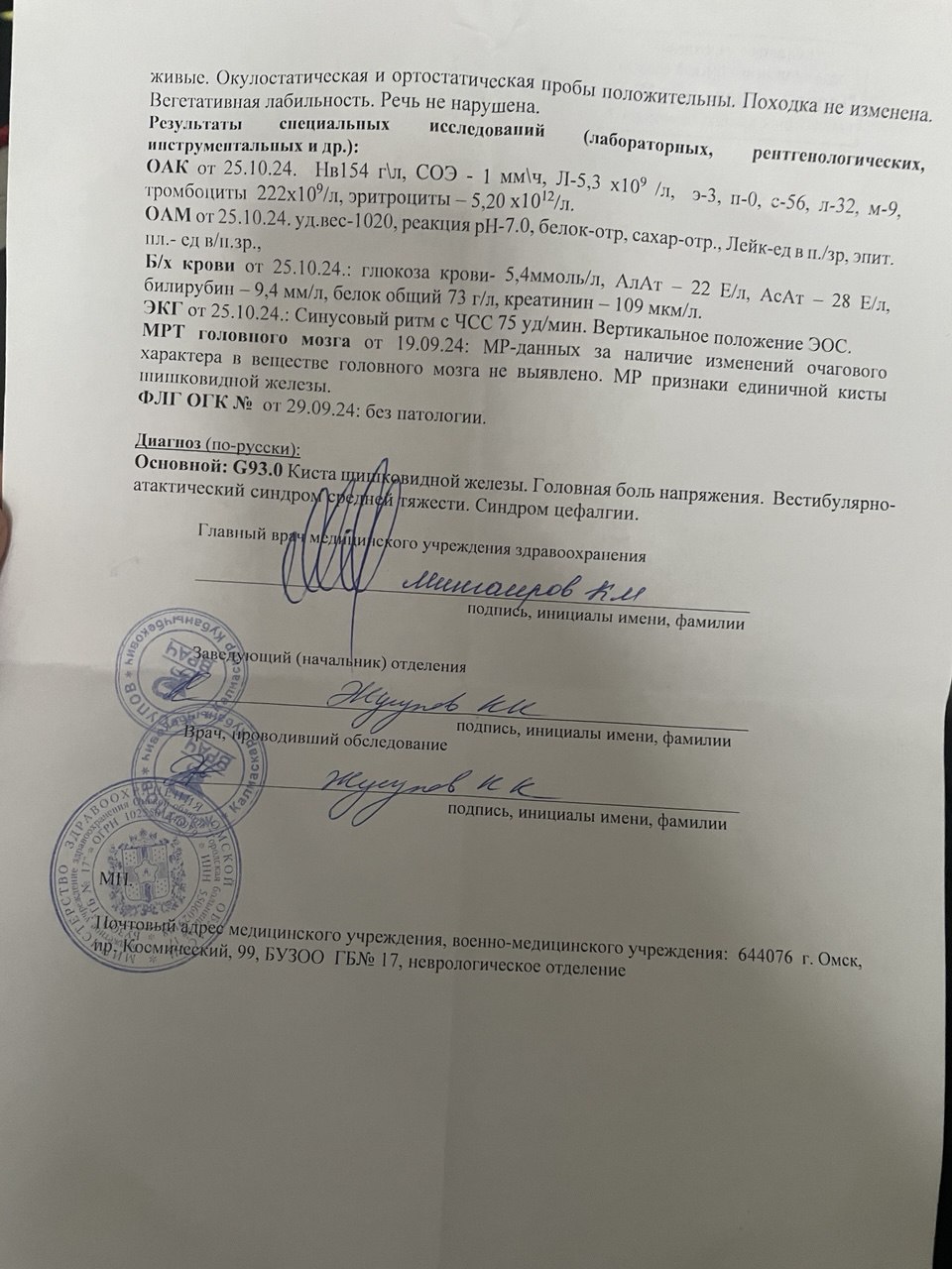 Даниил20381 писал(а):Здравствуйте, пришёл в военкомат. Районный мой выдал В категорию, областной военкомат отменил В категорию. Диагноз киста шишковидной железы, плюс есть явные симптомы, такие как вестибулярно аткатический синдром средней тяжести, синдром цефалгии и головная боль напряжение. Подскажите, пожалуйста, что делать и как это? Прикрепляю мед заключение по направлению от военкомата, а также мрт.