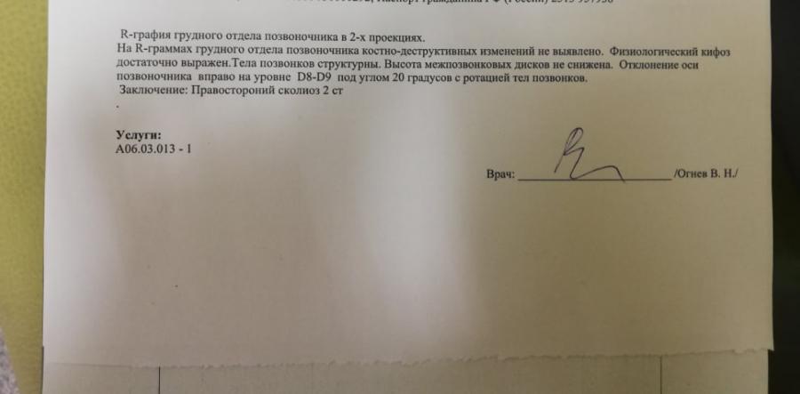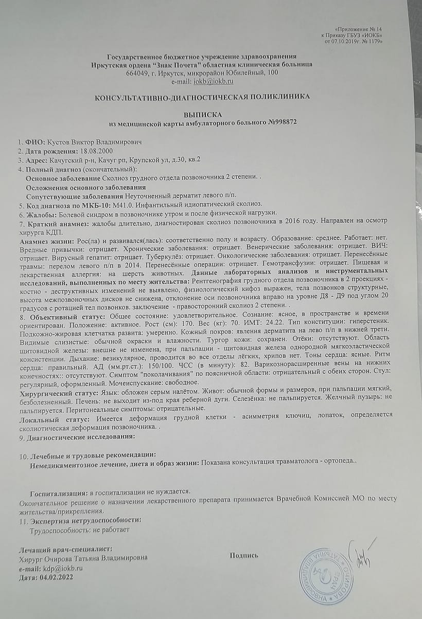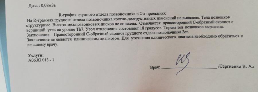 VictorKus писал(а):Здравствуйте, скажите пожалуйста есть ли шансы с этим заключение попасть в категорию В? Жалобы про сколиоз ещё с 2016 года идёт(что болит через часа 4 стоя) , есть ещё отдельный снимок только стоя где угол 20 градусов искривления.