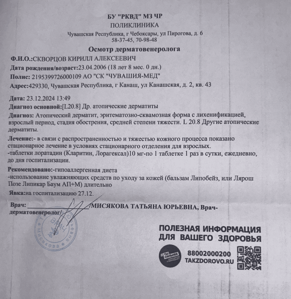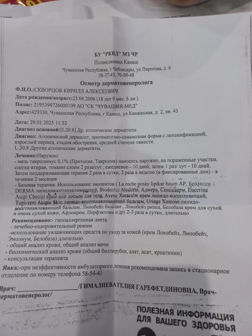 Здравствуйте, в этом году зимой было обострение, сходил в больницу, поставили атопический дерматит по итогам медицинских заключений из детской амбулаторной карты.