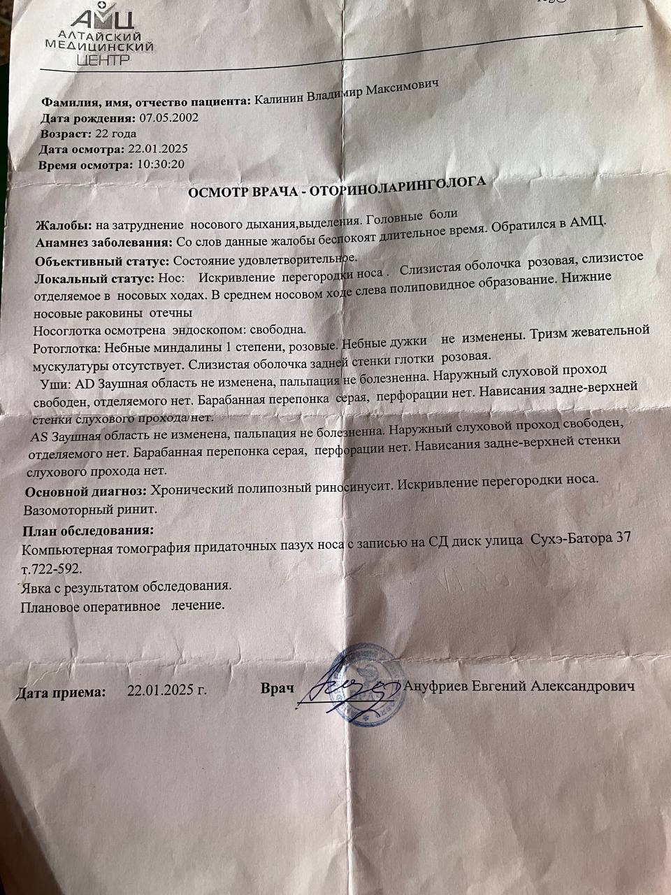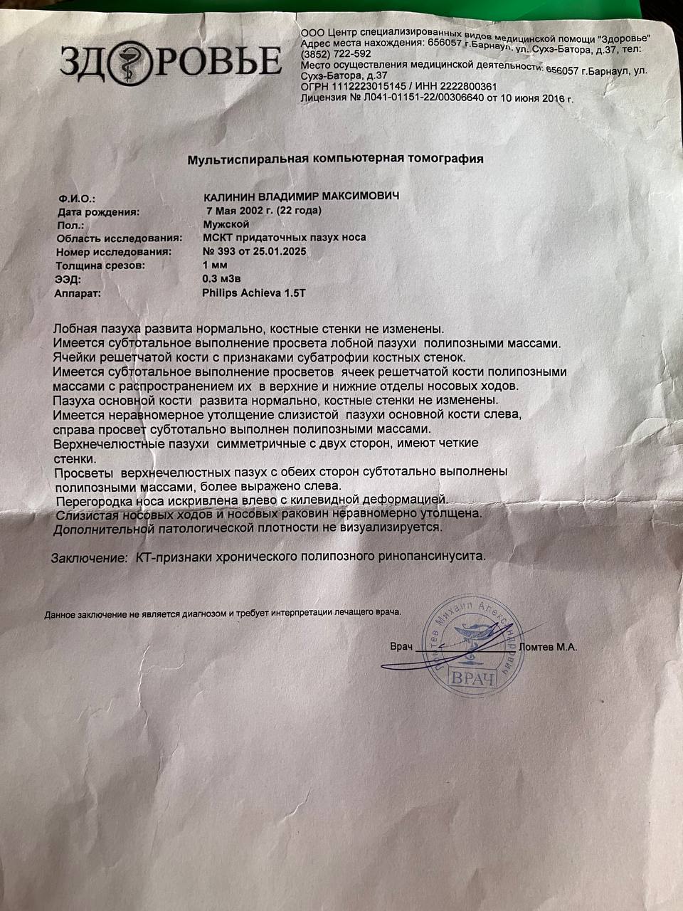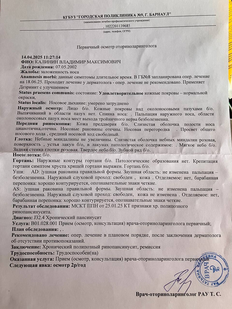 Здравствуйте, более полугода наблюдаюсь у лора с хроническим ринопансинуситом. В сентябре меня отправили на МСКТ и дали направление на операцию, результаты мскт на руках, диагноз подтвердился, операцию было решено перенести еще на год в связи с лечением у дерматолога. Зимой посетил частного врача, который подтвердил диагноз хрон. полип. синусита. Сегодня снова посетил гос.лора, в заключении указана ремиссия, а в диагнозе вообще отсутствует упоминание полипов. Куда будет смотреть военкомат, на диагноз или на заключение? Стоит ли мне самостоятельно пройти мскт еще раз, чтобы иметь более свежее обследование на руках или достаточно одного (трехмесячной давности)?