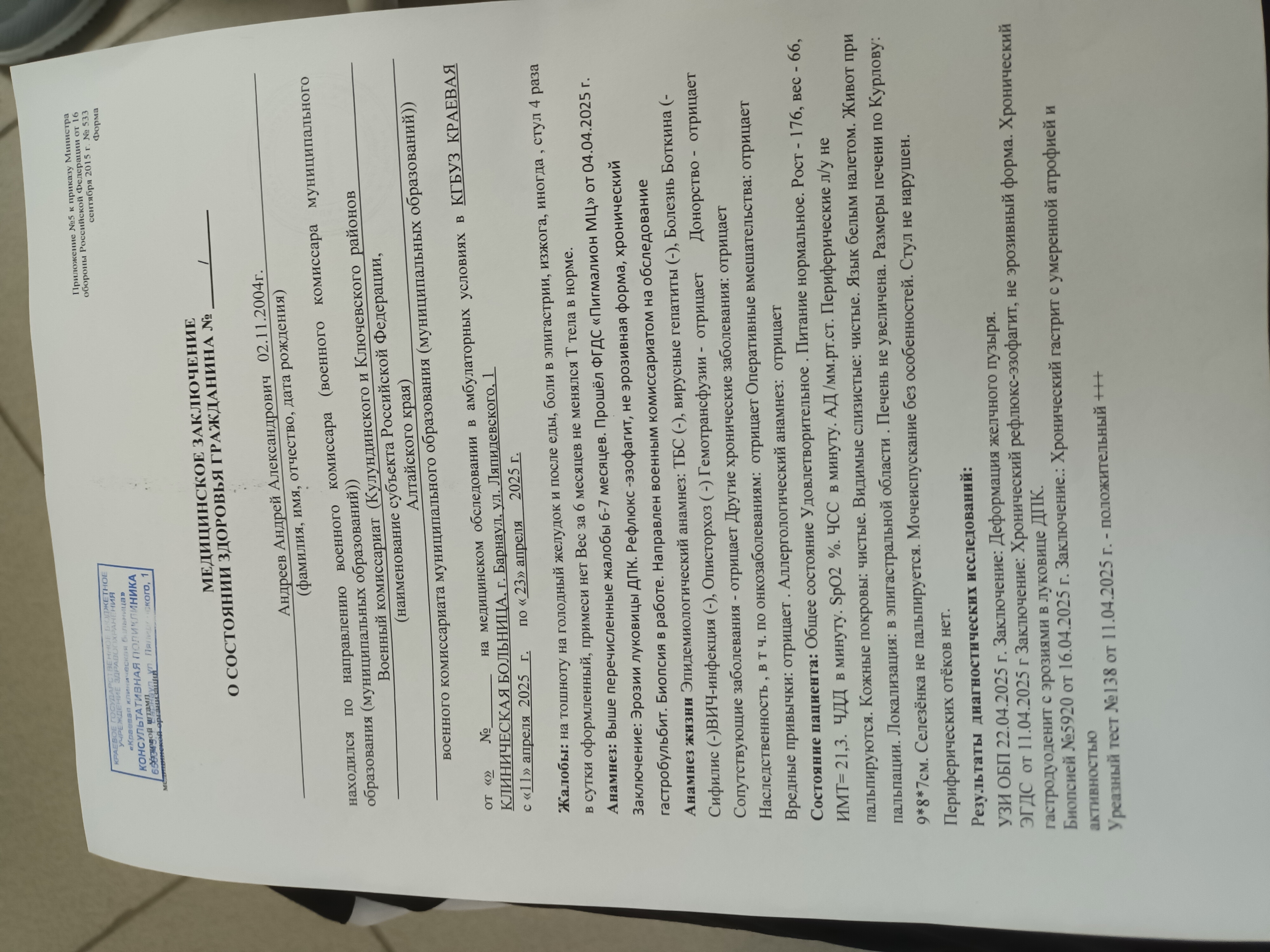 Заключение: Эрозии луковицы ДПК. Рефлюкс-эзофагит, не эрозивная форма, хронический гастробульбит. Биопсия в работе. Направлен военным комиссариатом на обследование Анамнез жизни Эпидемиологический анамнез: ТБС (-), вирусные гепатиты (-), Болезнь Боткина (-Сифилис (-)ВИЧ-инфекция (-), Описторхоз (-) Гемотрансфузии отрицает Донорство отрицает Сопутствующие заболевания отрицает Другие хронические заболевания: отрицает Наследственность, в т. ч. по онкозаболеваниям; отрицает Оперативные вмешательства: отрицает Вредные привычки: отрицает. Аллергологический анамнез: отрицает