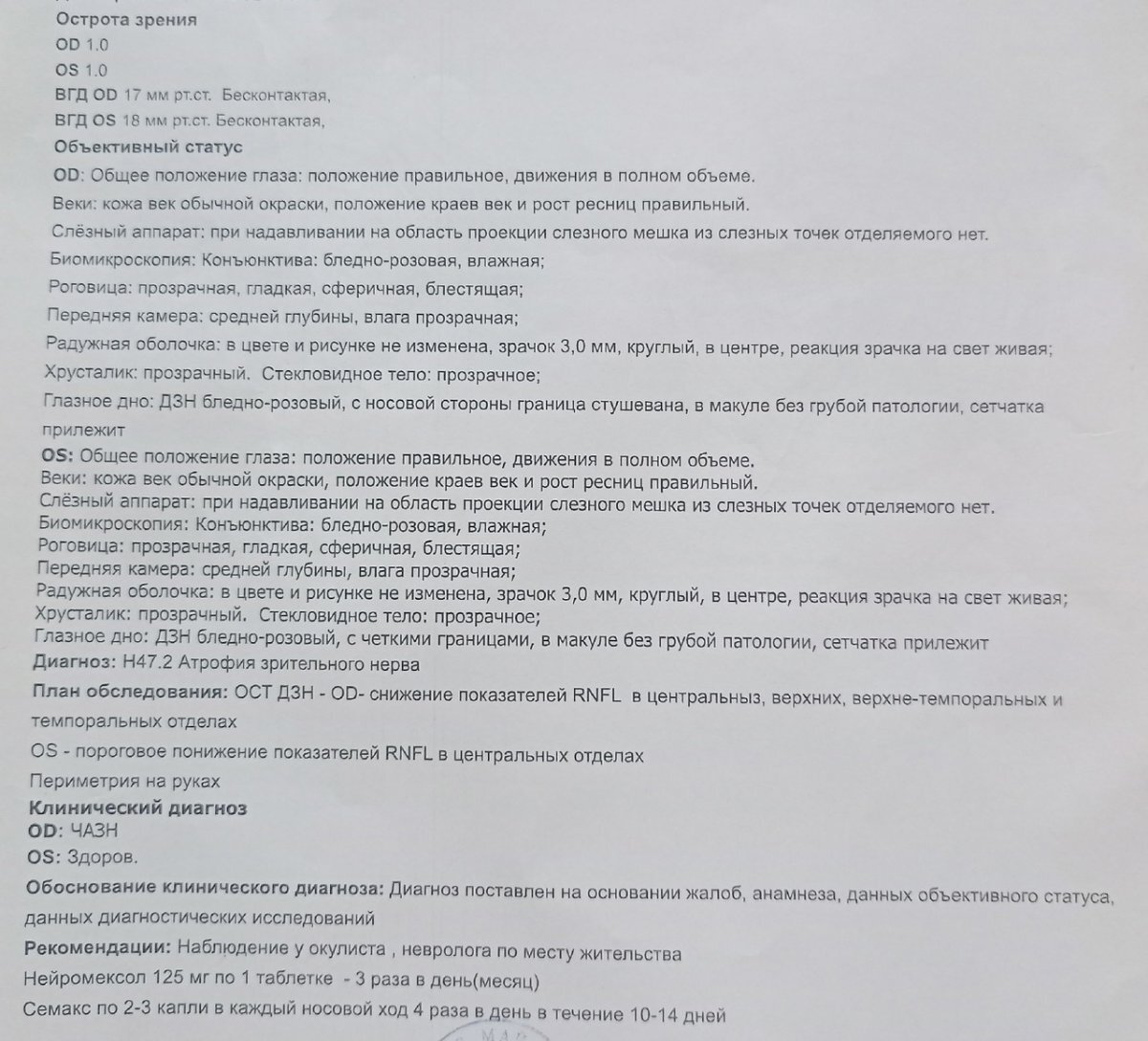 den98 писал(а):Здравствуйте, Алексей! Сходил к неврологу, как вы и сказали. Заключение мне не поставили, аргументируя это тем, что у меня нет заключения от моего окулиста, несмотря на то что диагноз ЧАЗН был поставлен мне в гос. клинике, и направление туда я брал, как раз-таки, у своего окулиста. А также сказали сделать рентген головного мозга, несмотря на то, что гидроцефальн. синдром у меня стоит с детства, и это зафиксировано в моей детской мед карте, а также имеются относительно свежие пометки. В общем не суть. Вопрос в следующем, может ли данный осмотр, прикрепленный на фото, рассматриваться как подтверждение моих диагнозов? Или получение "заключения" обязательно? Спасибо!