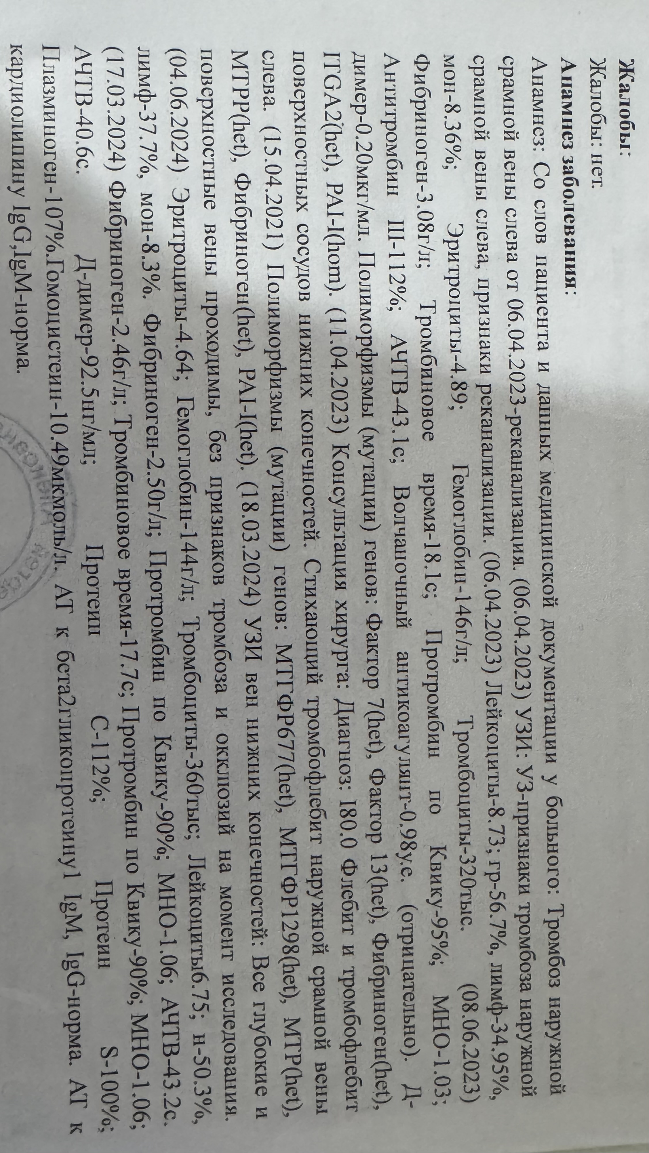 Врожденная гемофилия (мутация генов нескольких) + был тромб + постоянно наблюдается у врача и на препаратах.