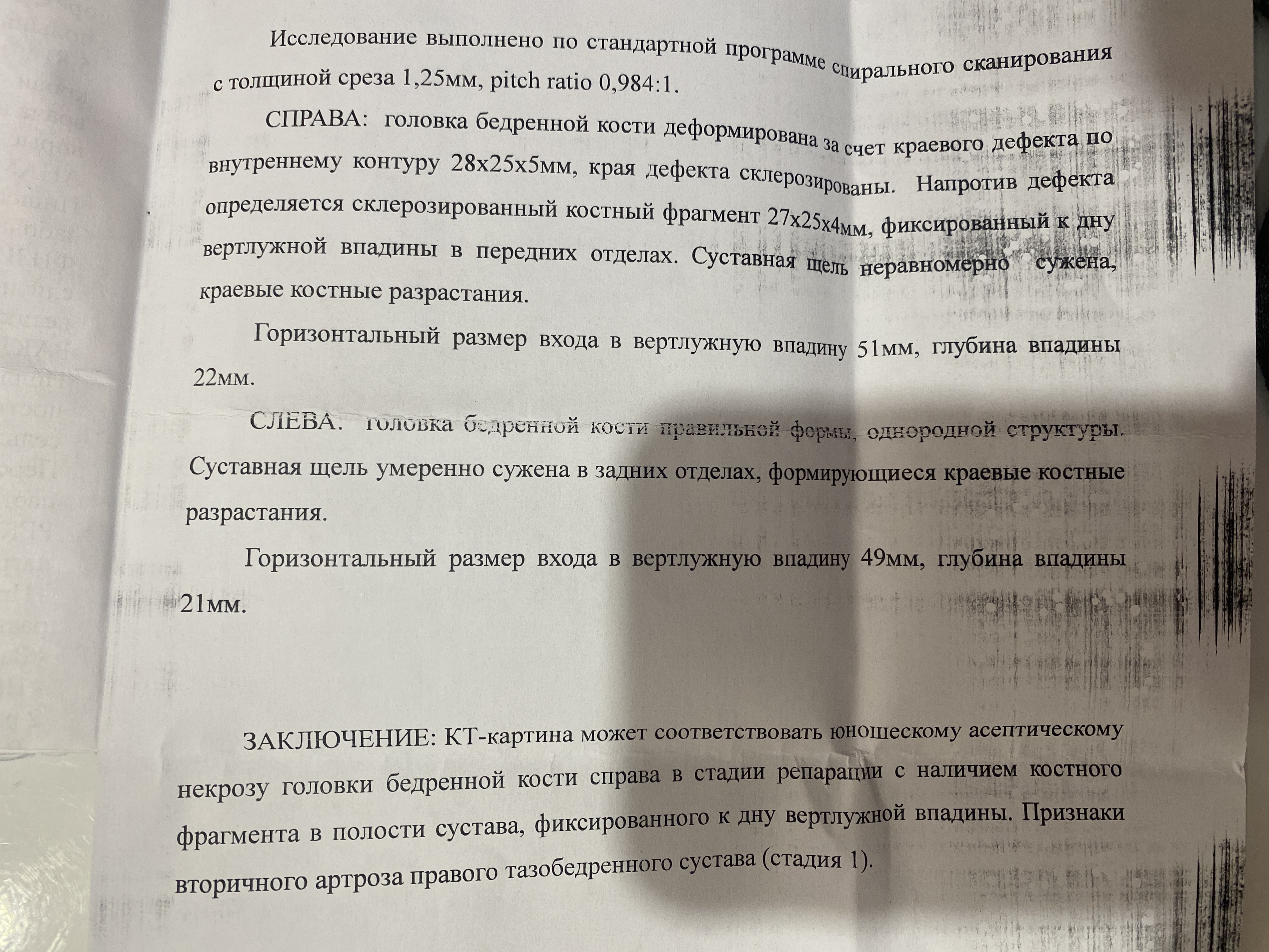 Мне поставили диагноз "Асептический некроз головки бедренной кости в стадии репарации с наличием костного фрагмента в полости сустава» фиксированного к дну вертлужной впадины.Признаки вторичного артроза поавого тазобедренного сустава(стадия 1)»