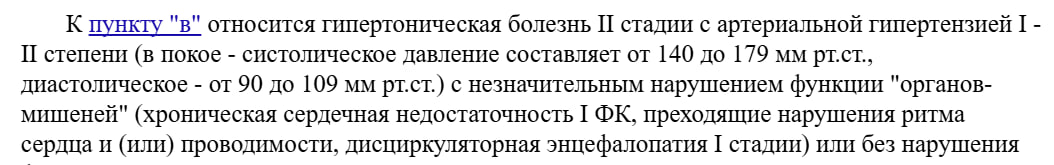 Но также там указано, что при наличии гипертонической болезни 2 стадии - не обязательно иметь нарушения функций органов-мишеней для соответствия на непризывную категорию годности "В" по статье 43, пункту "в" Расписания болезней.