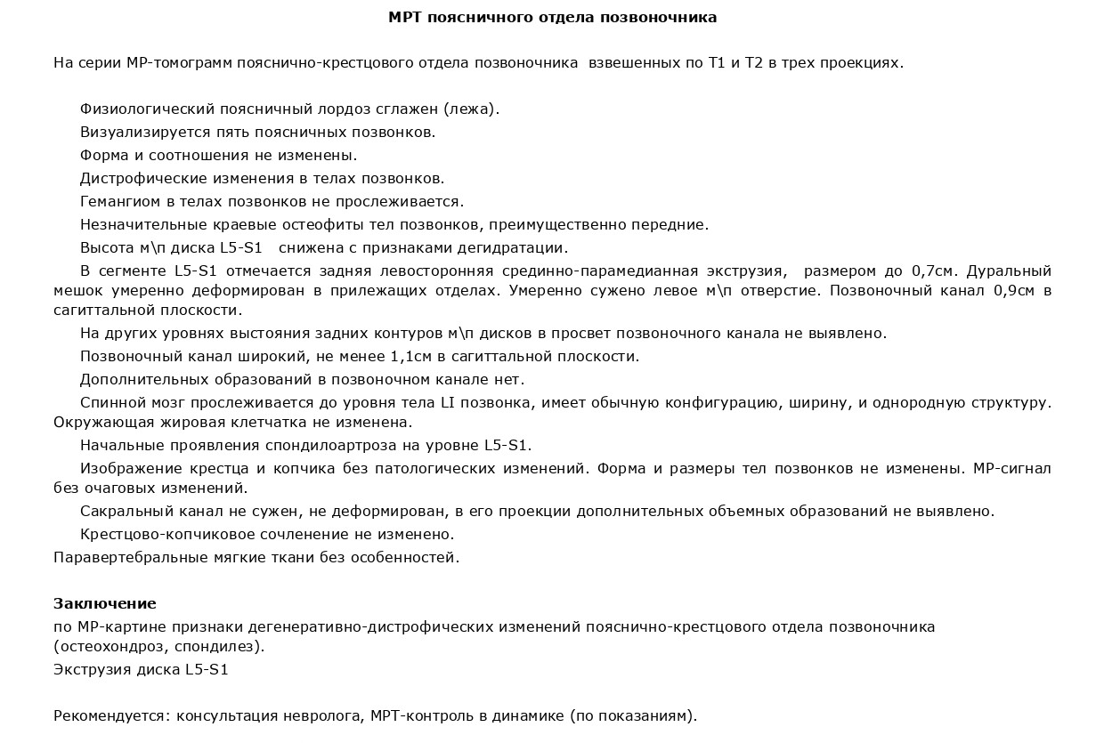 Rg - признаки умеренного нарушения статического и функционального состояния поясничного отдела позвоночника. Правосторонний сколиоз поясничного отдела позвоночника (1 степени). Признаки начальных дегенеративных изменений поясничного отдела позвоночника. Признаки начального спондилоартроза, более выраженного на уровне L3-L5. Признаки умеренного снижения высоты межпозвонкового диска на уровне L5-S1