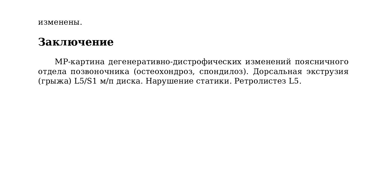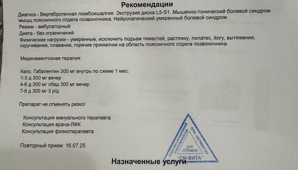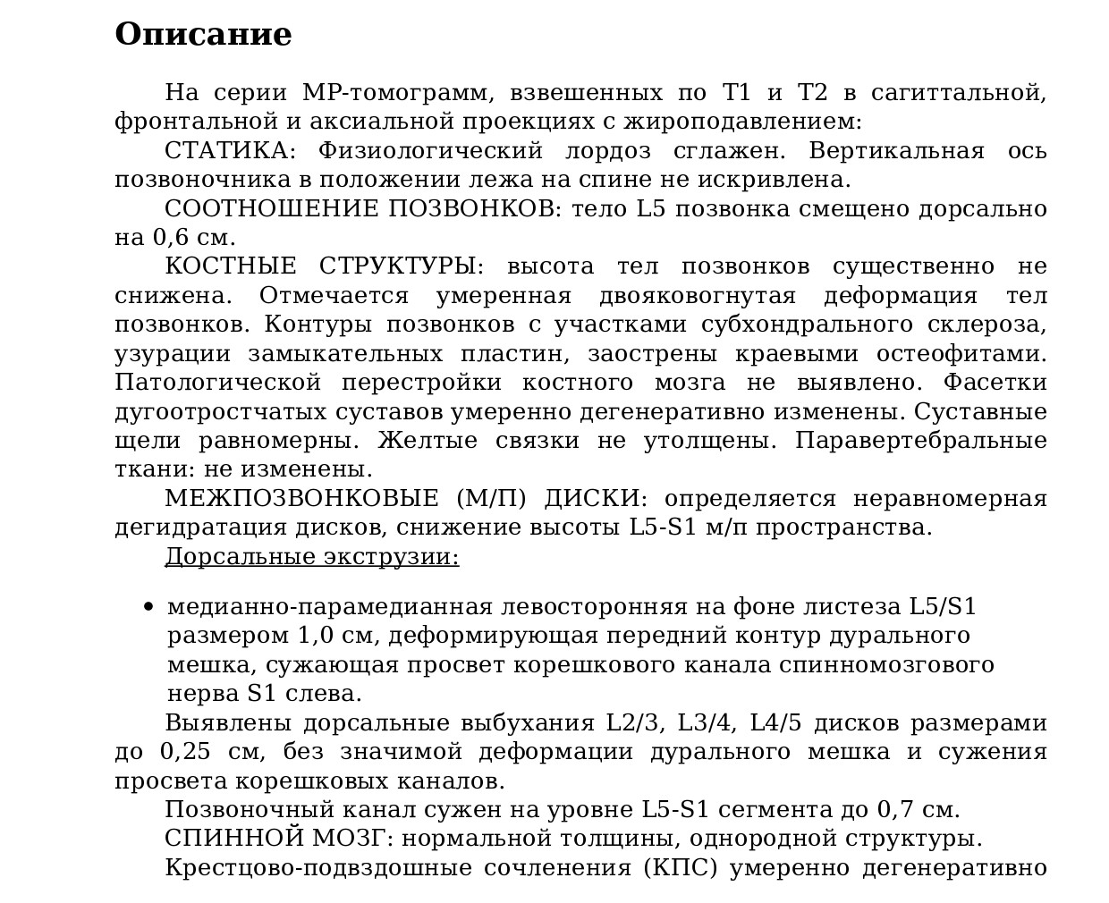 На момент 2025г. боли начали распространяться вдоль левой ноги. Повторно было сделано МРТ и рентген с назначения невролога с целью оценить текущее состояние позвоночника. На текущий момент имеется следующее заключение: