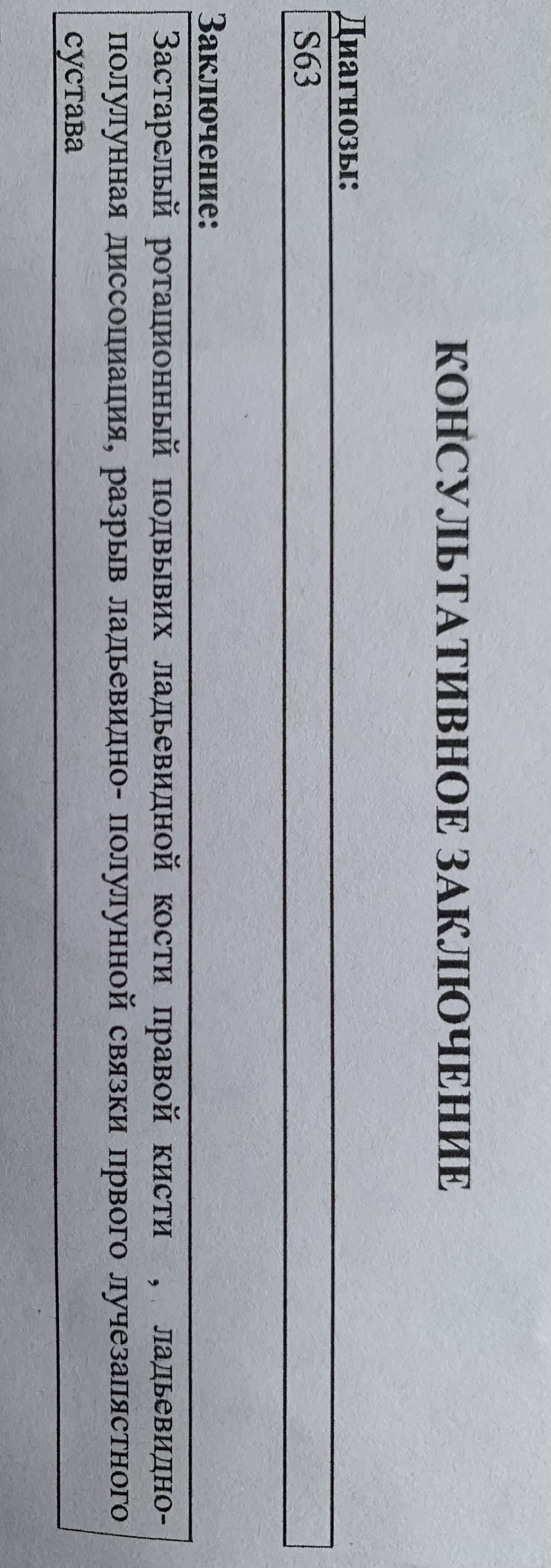 S63, Застарелый ротационный подвывих ладьевидной кости правой кисти , ладьевидно-полулунная диссоциация, разрыв ладьевидно- полулунной связки првого лучезапястного сустава