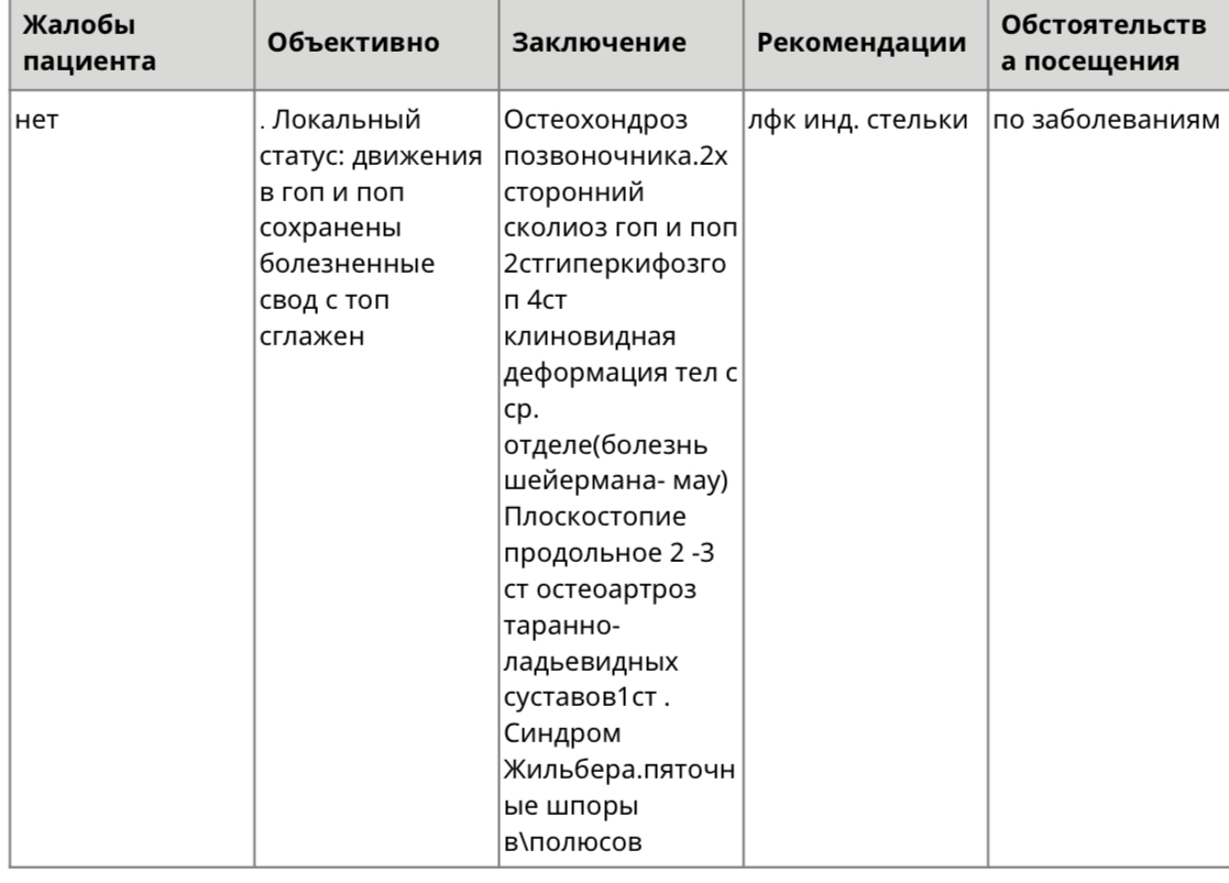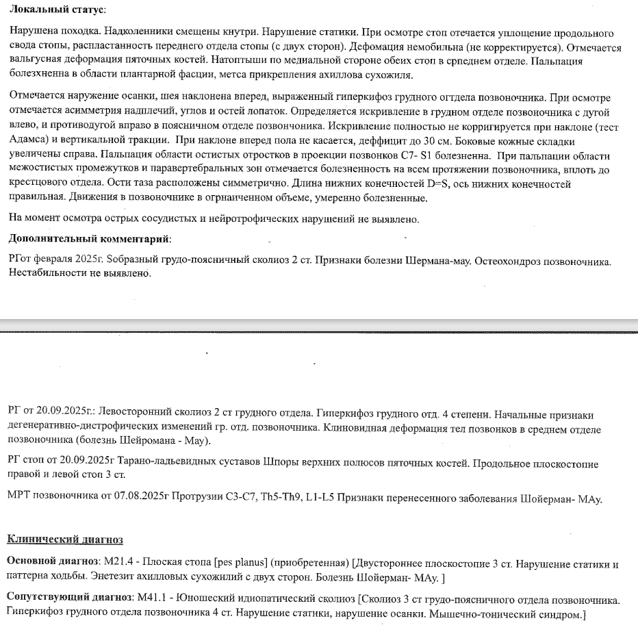 Диагноз: Остеохондроз, спондилоартроз шейного, грудного и поясничного отделов позвоночника на фоне нарушения статики: S-образный грудо-поясничный кифо-сколиоз 2 ст. Протрузии дисков С3-4-5-6-7, Th5-6-7-8-9, L1-2-3-4-5. Вертеброгенный болевой и мышечно-тонический синдромы. 2-х стороннее продольно-поперечное плоскостопие: справа 2-й, слева 3-й степени с артрозом таранно-ладьевидных суставов 2-й степени; двусторонний плантарный фасциит.
