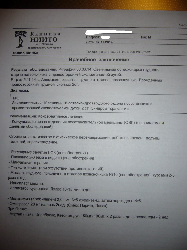 заключение врача: Ювенильный остеохондроз грудного отдела позвоночника с правосторонней дугой 2ст. синдром торакалгии.