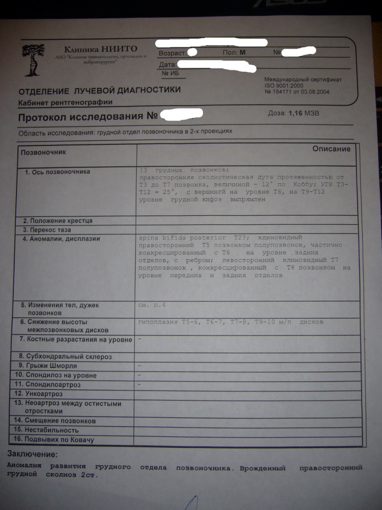 заключение рентгенолога: аномалия развития грудного отдела позвоночника. врожденный правосторонний грудной сколиоз 2 ст.