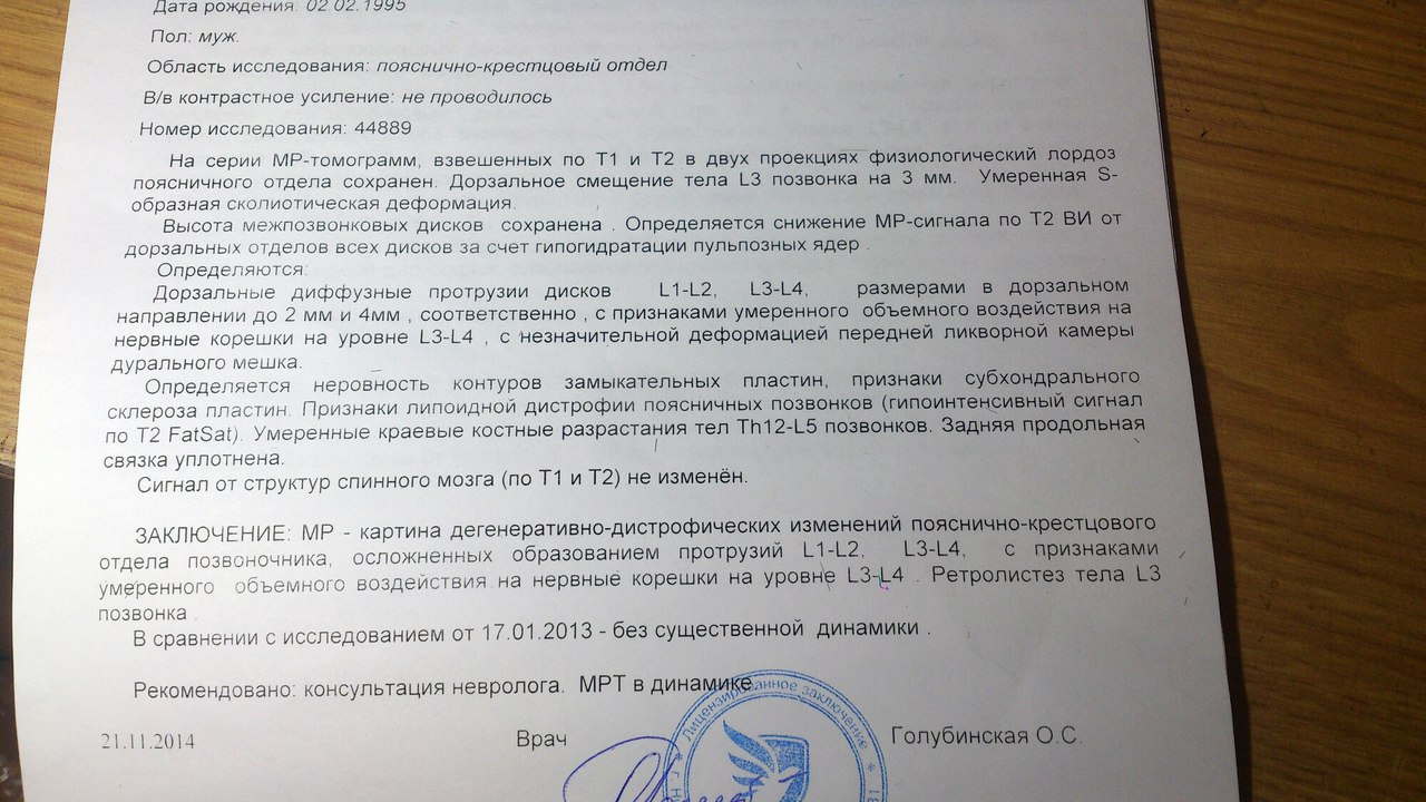 Умеренные дистрофические изменения поясничного отдела позвоночника. Протрузии дисков на уровнях L3-S1. Относительный стеноз спинно-мозгового канала на уровне тел L4. Рекомендовано наблюдение у невролога.