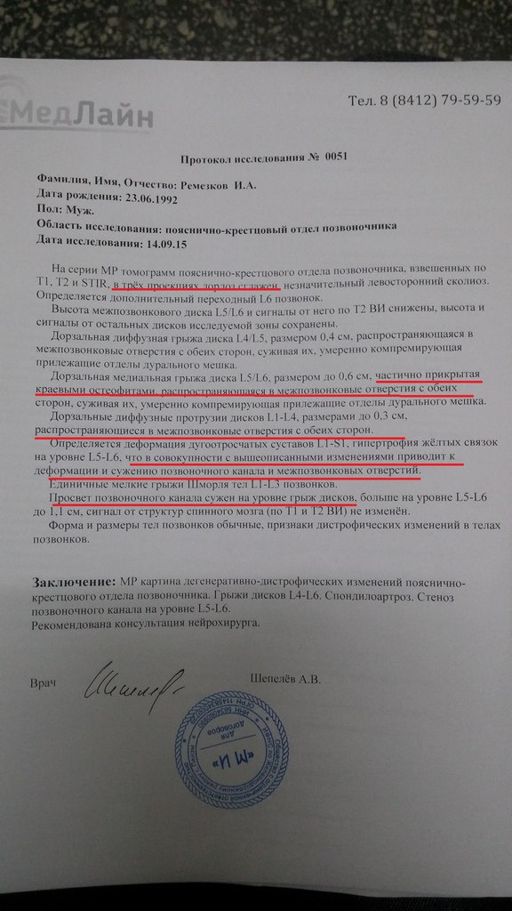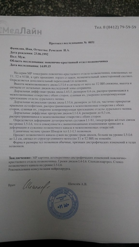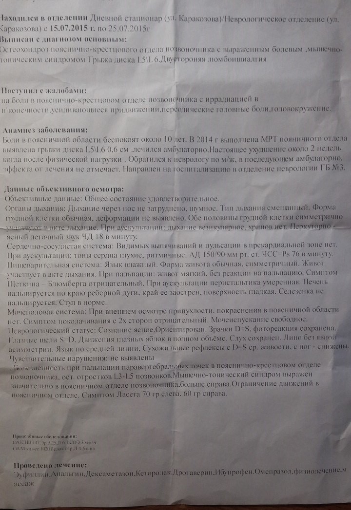 Диагноз. Остеохондроз грудного и поясничного отделов позвоночников . болевой синдром. Двухсторонняя люмбоишиалгия. Грыжа диска L5/L6 протрузии L1-L4. стеноз позвоночного канала на уровне L5-L6.