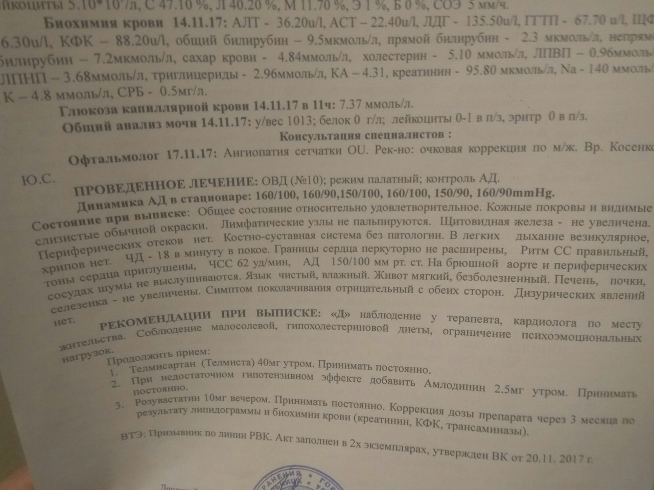 В октябре так же был направлен в стационар где поставили диагноз нейроциркуляторная дистанция по гипертоническому типу значительно выраженной степени.динамика ад 150/100, 145/90,150/100, 150/90.