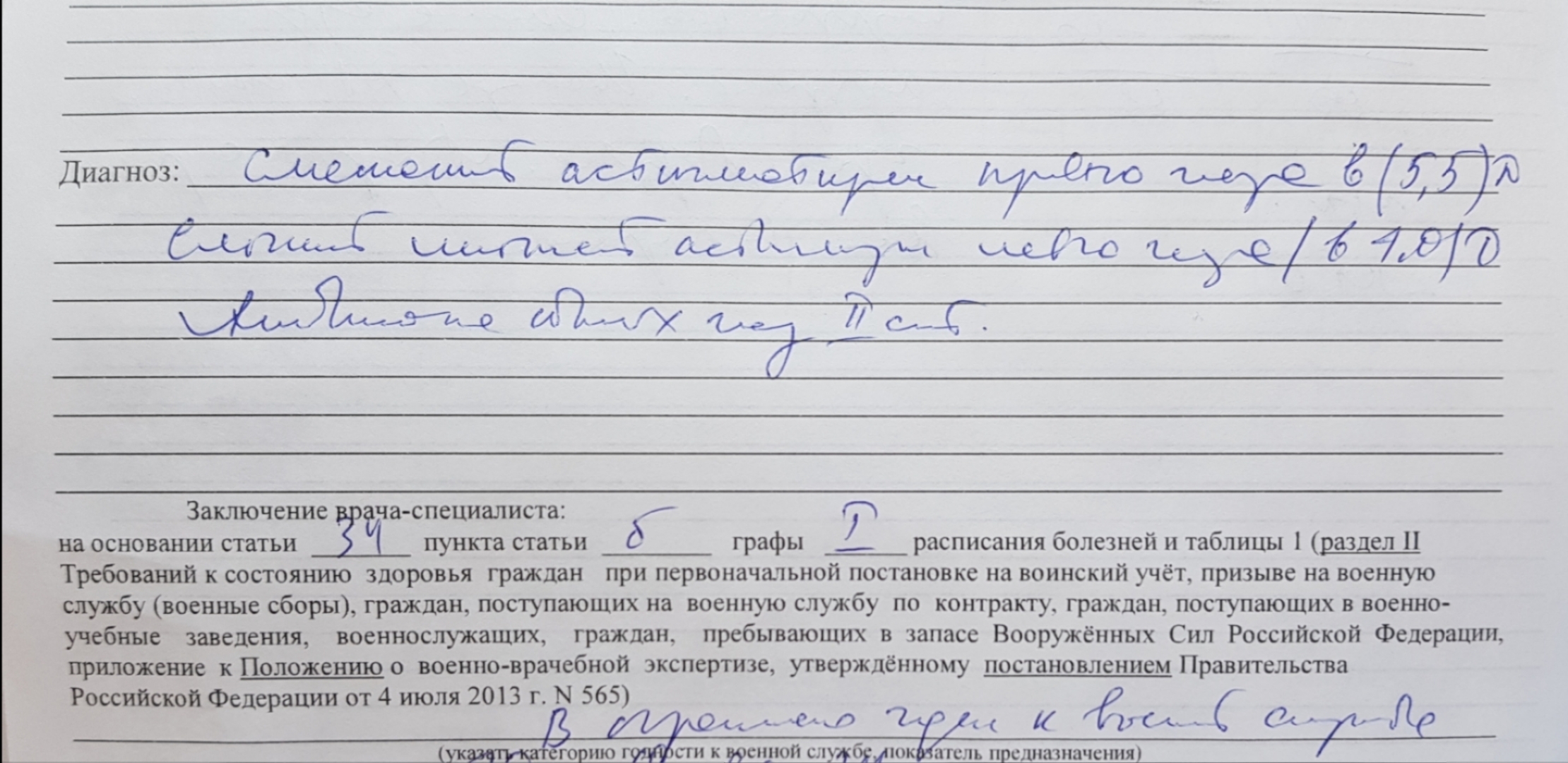 Здравствуйте, хотел ты узнать берут ли в армию с моим зрением и наличием астигматизма, в ноябре ходил смотреть очки и мне там сразу проверили зрение и написали там: для дали PD 66, OD - sph. pl., cyl- -2,0, ax- 180; OS- -1,75, cyl- -2,0, ax- 175; и вот не давно сходил к окулисту и там мне выдали другой рецепт на очки где написано вроде, правый сфера вверх -1,0, и левый сфера вверх -1,0; расстояние между центрами зрачков глаз 66-68.