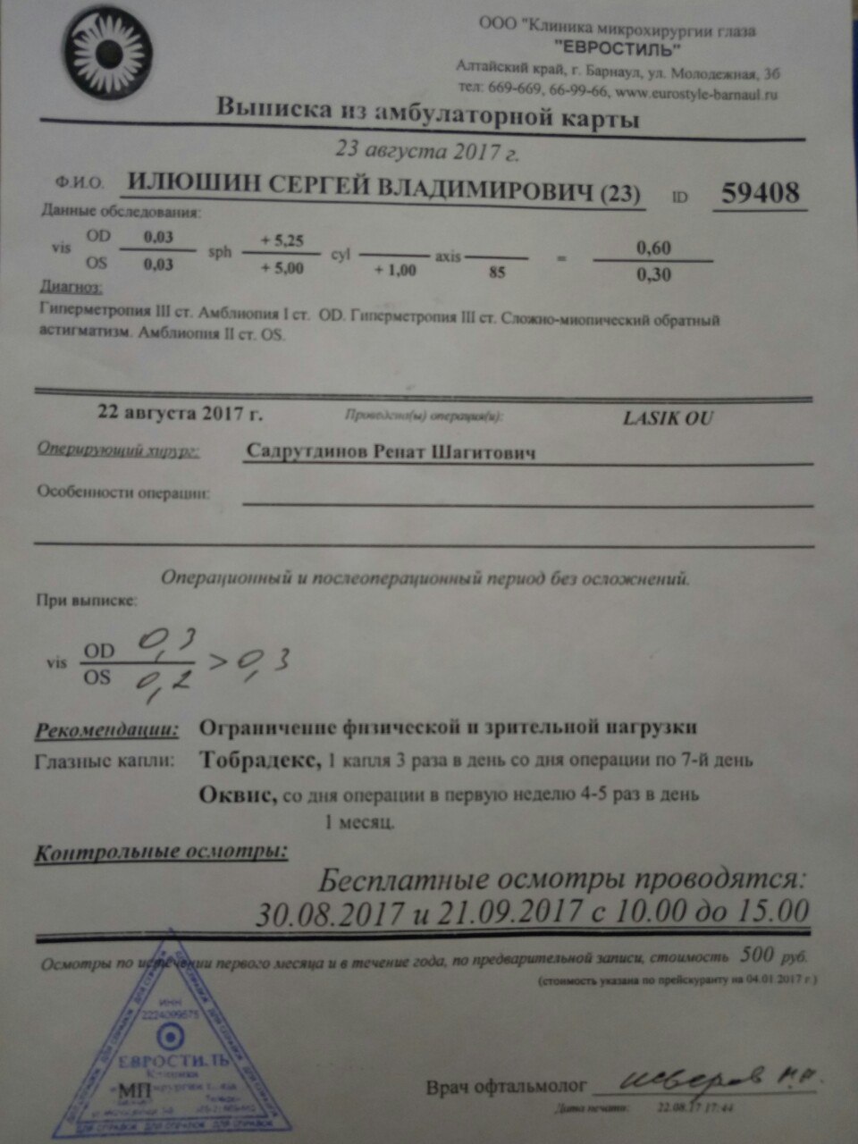 после операции: правый глаз (0.3); левый глаз (0.2);